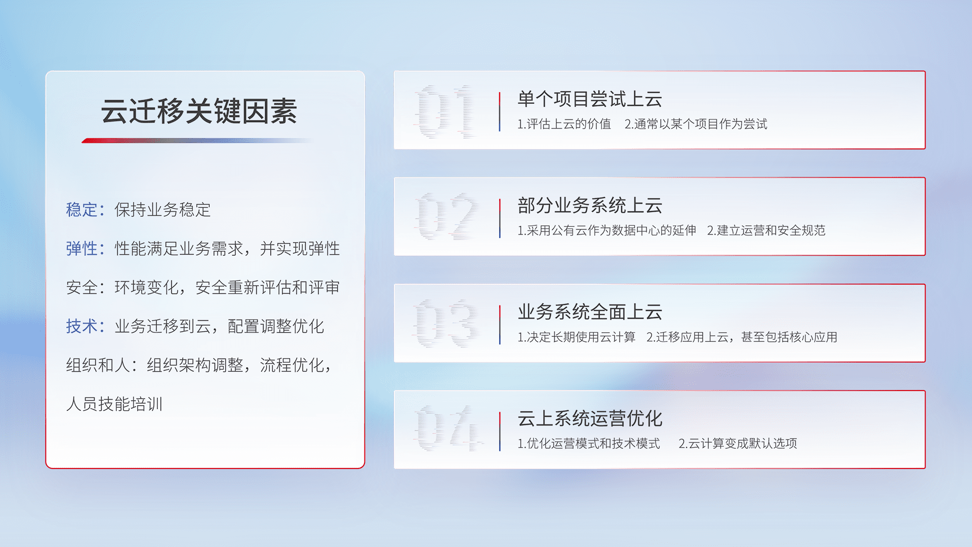 结合实际业务,,从规划设计、、、、云平台选型、、、云原生改造、、数据迁移、、、集成交付,,,,迁移全过程为客户识别最佳上云路径,,,做好风险识别管理,,,,设计网络架构、、身份权限、、、、安全审计合规、、、操作审计、、、、日志审计、、、、监控告警策略、、、多站点容灾设计等,,,,对云上基础设施进行整体规划,,,提升IT治理水平,,以满足弹性、、、高可用、、、高性能的需求。。。
