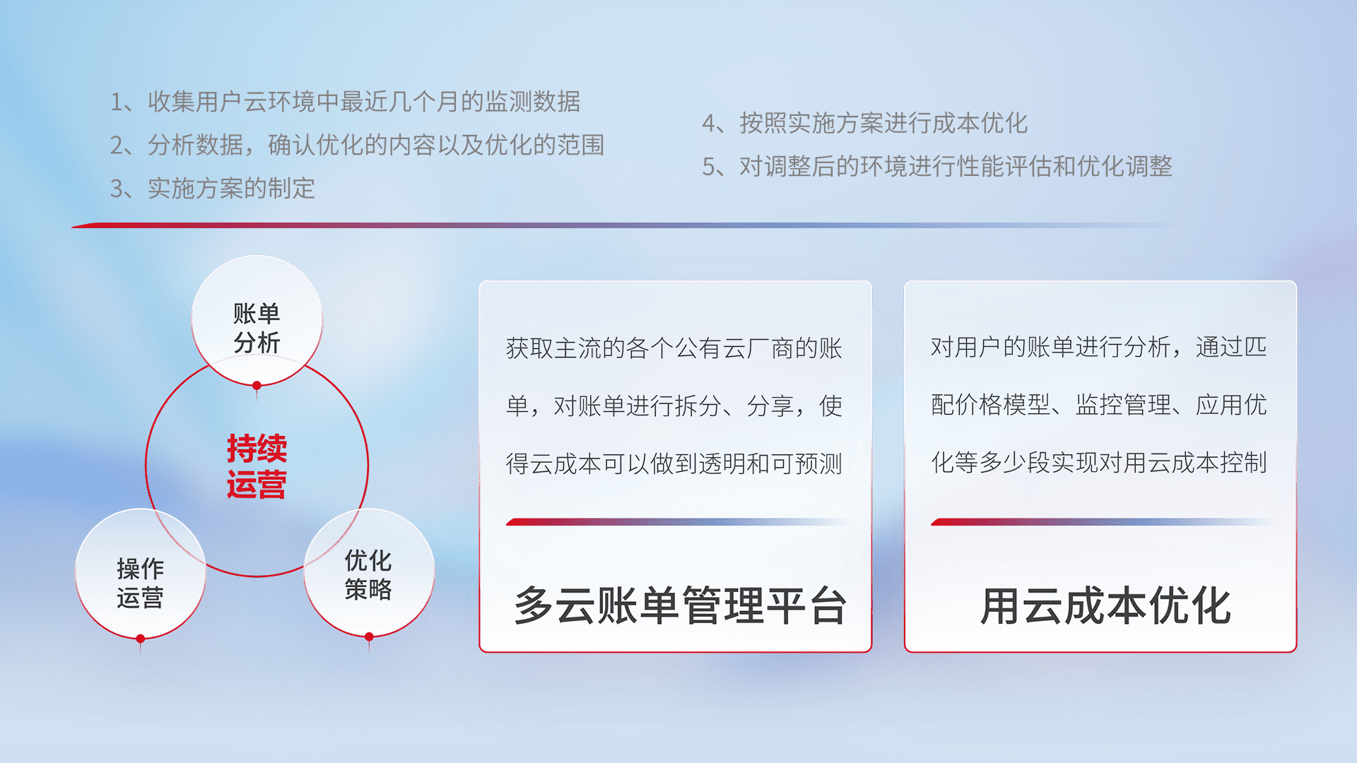 通过多云纳管,,,以统一的资源数据模型把客户的云资源进行抽象和封装,,,进而实现对多云资源的统一操作,,,保障云资源管理的可靠性、、、稳定性与可用性。。。量身定制化运维内容,,配置、、开发运维、、、、补丁管理、、、备份、、监控、、、、认证和访问管理、、、、审计和日常巡检等,,,,保障在用云过程中的可靠度,,,,稳定度以及高可用率。。。。